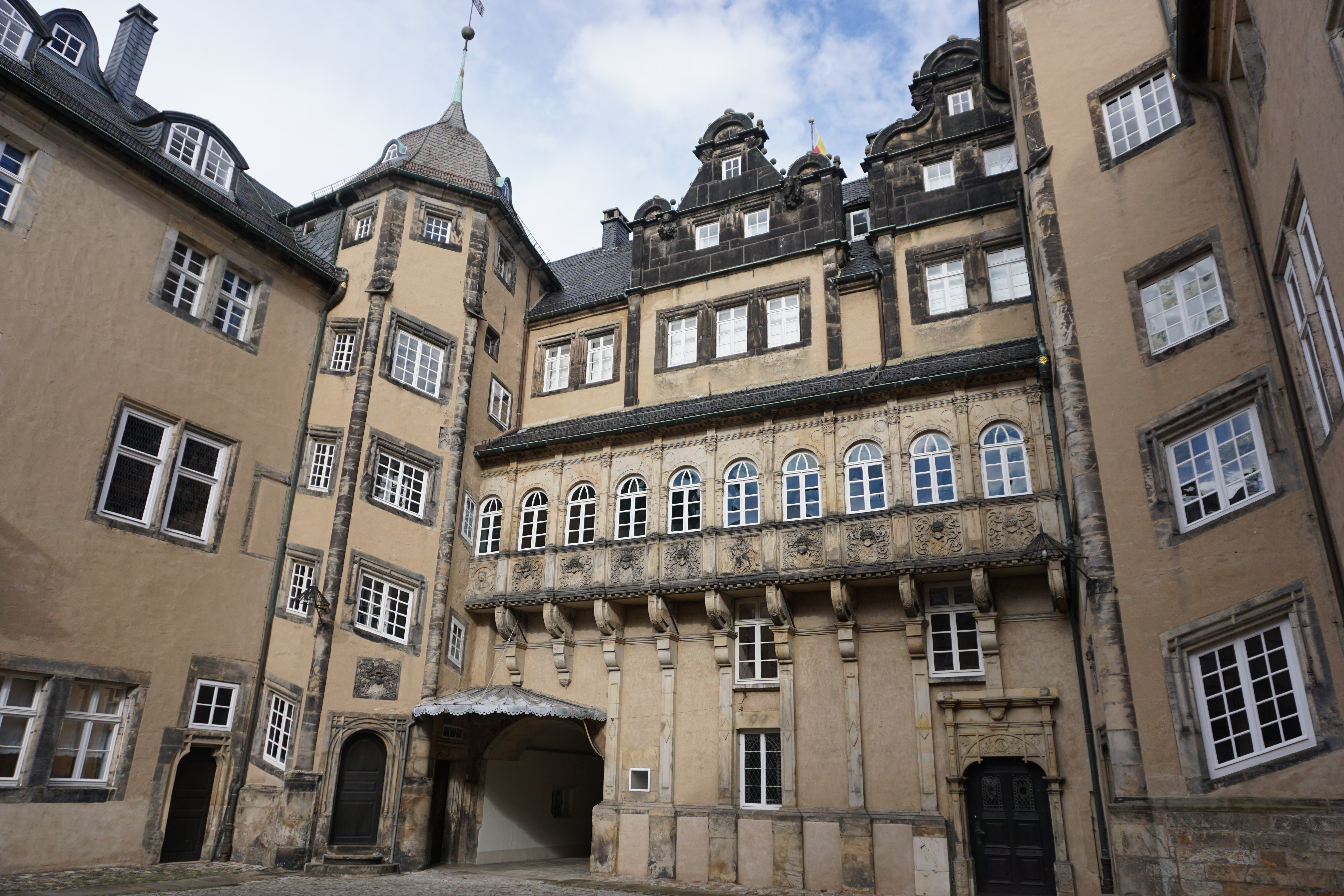 Hier die Ansicht vom Innenhof aus mit Treppentürmen und Steingang.